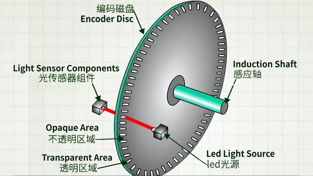 光学编码器原理,通常由旋转和固定电子电路组成。转子通常是安装在编码器轴上的金属材质、玻璃材质或塑料材质的圆盘。该盘具有某种光学图案,通过电子解码产生位置信息。绝对光学编码器中的转子盘使用以格雷码图案排列的不透明和透明段。定子具有相应的成对的 LED 和光电晶体管,LED 光通过转子盘的透明部分照射并被另一侧的光电晶体管接收。在电子信号被放大和转换后,就可以用来确定他的位置。