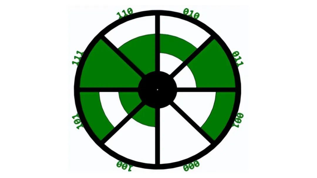 最广泛使用的分类是指运动的类型(线性或旋转)。在这两种情况下,它们可以是增量的、半绝对的或绝对的,通过简单地计算脉冲来获得增量信息。所以,它取决于先前的状态和转换的值。它的最大缺点在于需要定义零点开始的位置:如果突然断电的情况下,此信息都会丢失。相比之下,在绝对值编码器中,每个位置都使用唯一的正确参考代码,如下图,对应于各种轨道中的独特位模式。因此,位置始终是已知的,如果系统断电或关闭,则无需定义参考。