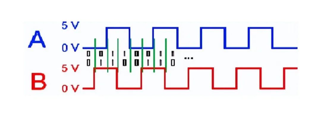 因此,可以通过逻辑值 0 和 1 对出现的顺序来检测方向。也就是说,如果在 01 之后收到 11,则表示向右移动,而收到 00 将表示向左移动。但是,这不是唯一可用的优势,从图 4 中绿线分隔的二进制对序列可以看出。只有一个光学传感头,每个周期只有一个脉冲,但如果有两个光学头,一个周期将对应四个脉冲。图 4 显示了两个相关通道(A 和 B)的输出,有助于理解一个通道(A 或 B)的每个周期的四个脉冲的出现,以及通过组合两个波形成的逻辑电平。随着状态从 00 到 01 等的每一次变化,新的组合都会引起计数操作的另一个步骤。