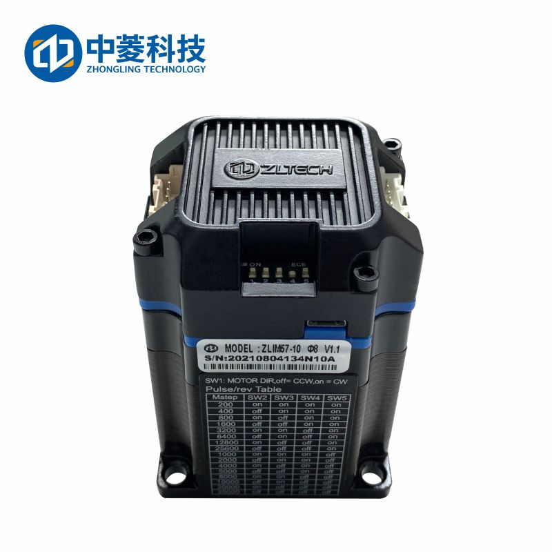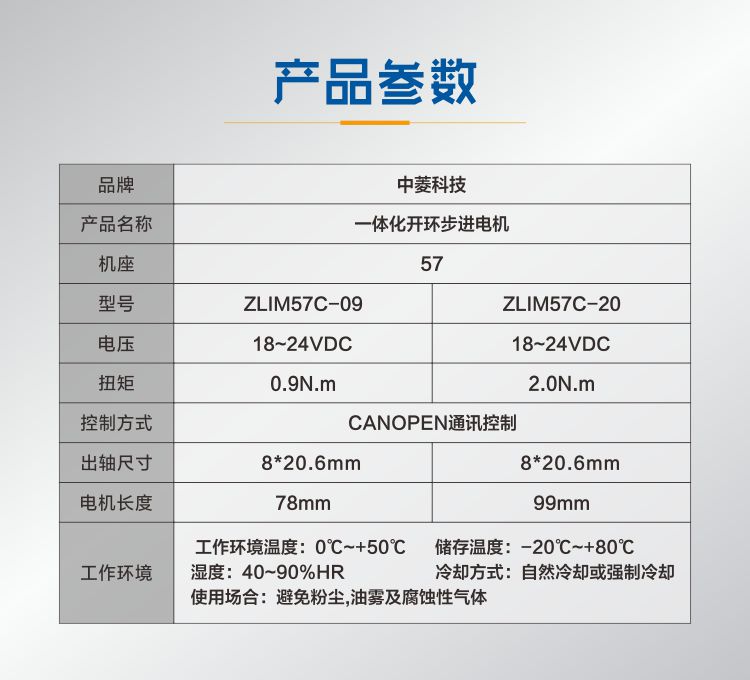ZLIM57-C 为高性能数字式集成驱动一体的两相混合式开环电机,系统结构简单,集成度高,增加了总线通讯及单轴控制器功能。总线通讯采用 CAN总线接口,协议上支持 CANopen 协议的 CiA301 及 CiA402 子协议。