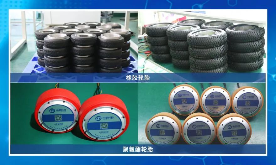 深圳中菱科技的机器人轮毂伺服电机系列产品中,小功率轮毂电机使用的是实心橡胶轮胎,重载大功率轮毂电机使用的是聚氨酯轮胎,13寸-16寸大功率轮毂电机使用的是橡胶充气轮胎,也可以根据客户项目需求定制不同尺寸、材质、硬度、花纹等的轮胎。