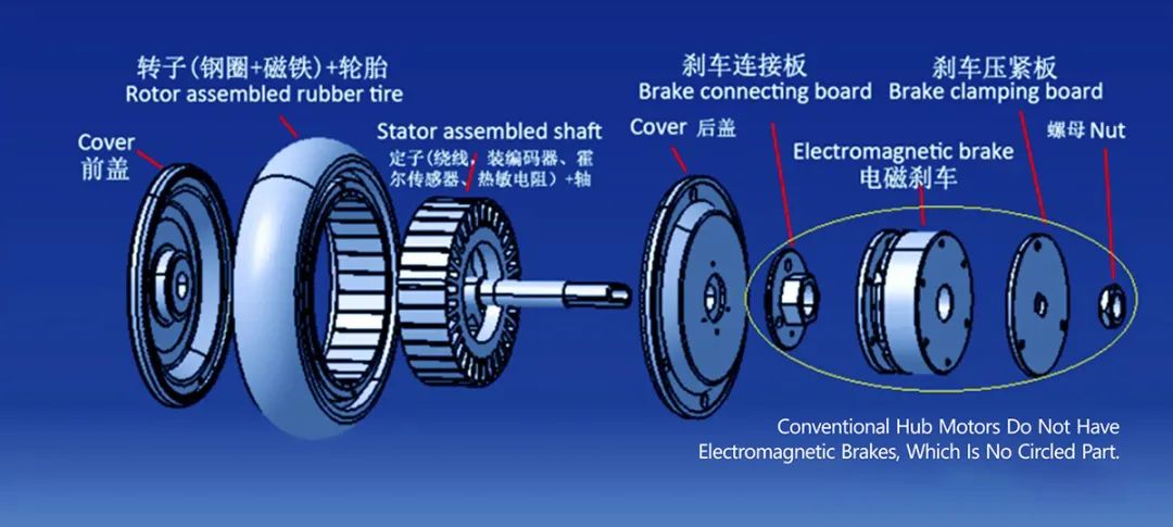 常规轮毂电机不带电磁刹车,带电磁刹车的轮毂电机除了以上配件,还包括刹车压紧板、电磁刹车、刹车压紧板、螺母。此种属于直流无刷轮毂电机,且结构特点限制了转矩常数的设计范围,使得电机需要以输出高电流才能输出高转矩。