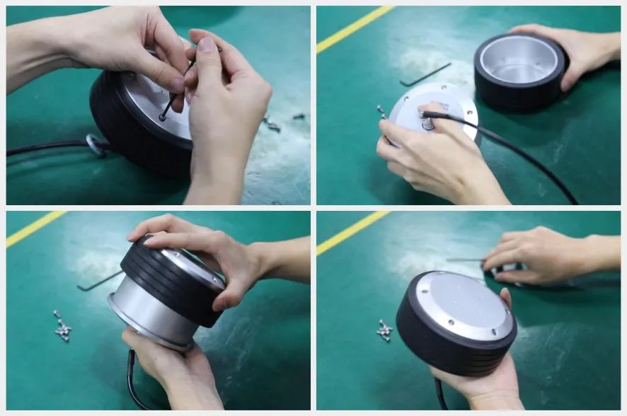 作为外转子轮毂电机供应商领头羊的深圳中菱科技,通过在轮胎与转子之间增加一个外壳支架,使得轮胎与外壳紧固在一起,并通过特殊结果,使得很容易将轮胎支架结构脱离于定子。每当机器人的轮胎出现磨损后,可以只单独更换轮胎支架结构,易于操作,成本很低,从而很好的解决了更换轮胎的难题。