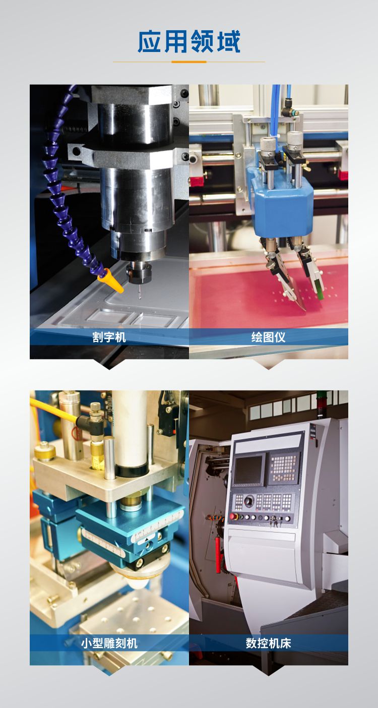 适合各种小型自动化设备和仪器,例如:气动打标机、贴标机、割字机、激光打标机、绘图仪、小型雕刻机、数控机床、拿放装置等。在用户期望小噪声、低振动、高平稳性、高精度的设备中应用效果特佳。
