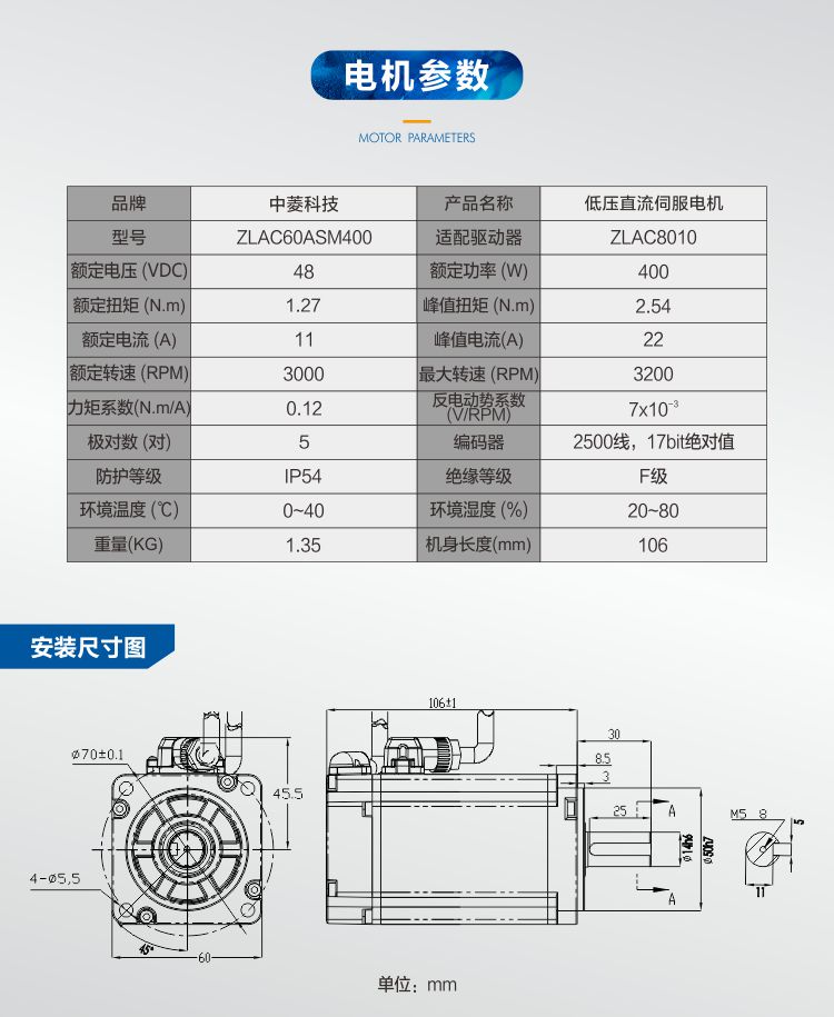 • 中菱科技ZLAC60ASM400 400W直流无刷伺服电机60法兰8010驱动器套装内置编码器