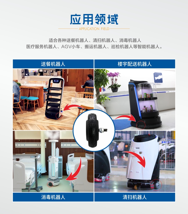 机器人轮毂电机优点明显,体积小、结构简单、动力响应快、成本低、易于安装等,非常适用于各种智能服务机器人,如送餐机器人、清扫机器人、消毒机器人、小载重搬运机器人、分拣机器人和巡检机器人等。这种轮毂电机应用范围很广,遍布人类生活的各类场所。