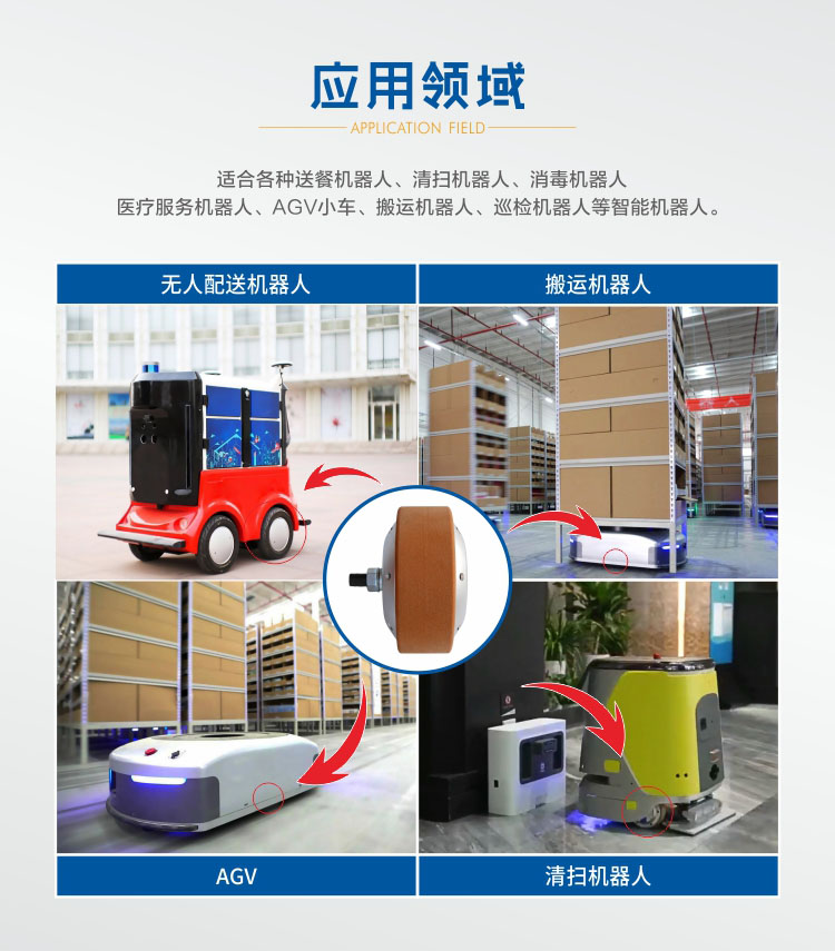 机器人轮毂电机优点明显,体积小、结构简单、动力响应快、成本低、易于安装等,非常适用于各种智能服务机器人,如送餐机器人、清扫机器人、消毒机器人、小载重搬运机器人、分拣机器人和巡检机器人等。这种轮毂电机应用范围很广,遍布人类生活的各类场所。