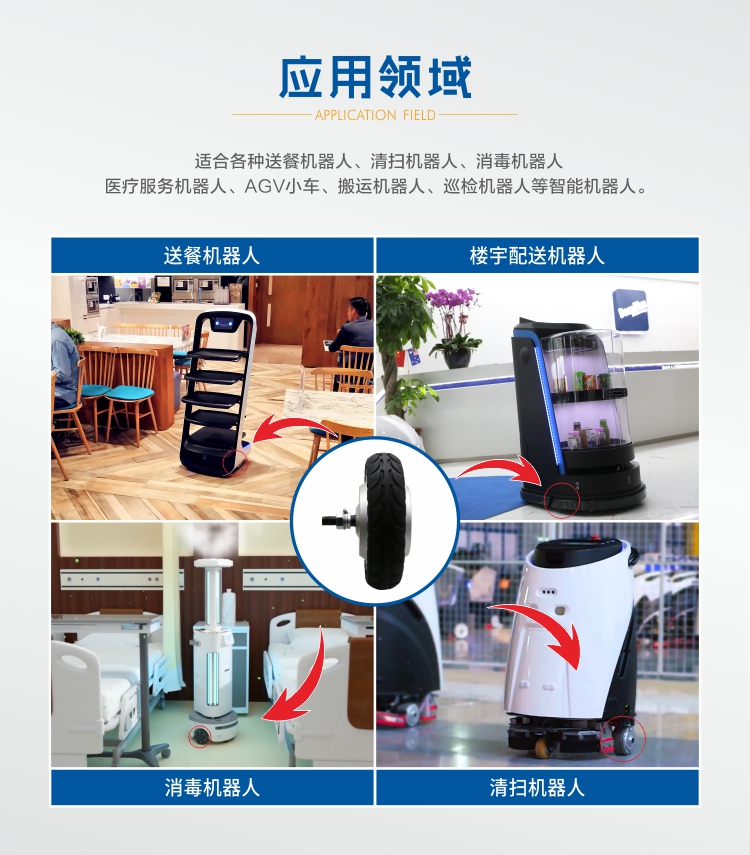 机器人轮毂电机优点明显,体积小、结构简单、动力响应快、成本低、易于安装等,非常适用于各种智能服务机器人,如送餐机器人、清扫机器人、消毒机器人、小载重搬运机器人、分拣机器人和巡检机器人等。这种轮毂电机应用范围很广,遍布人类生活的各类场所。